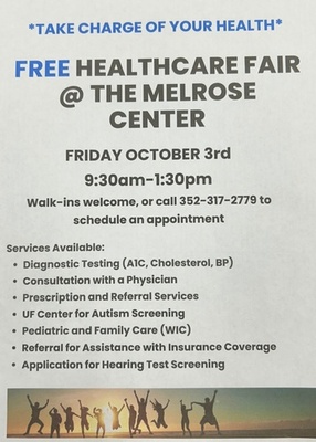 Take charge of your health with the free healthcare fair! Walk-ins are welcome, or call (352) 317-2779 to make an appointment. Services available include: diagnostic testing (A1C, Cholesterol, BP), consultation with a physician, prescription and referral services, UF Center for Autism screenings, pediatric and family care (WIC), referral for assistance with insurance coverage, and applications for hearing test screenings.